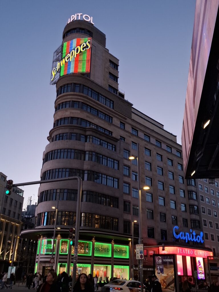 Uno de sus puntos más famosos es Plaza del Callao, donde se pueden ver pantallas gigantes al estilo Times Square y el cartel luminoso del cine Callao. Desde sus terrazas hay vistas espectaculares de la ciudad.